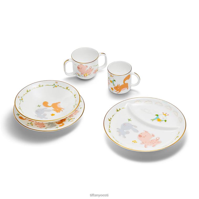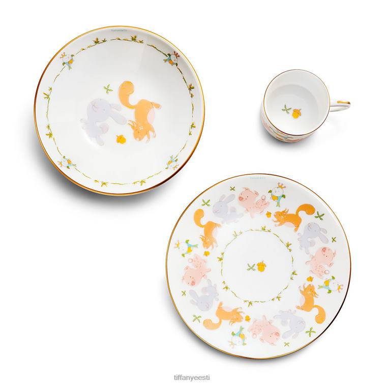 Sa pole ilusate kujunduste jaoks kunagi liiga noor. meie pisike tiffany kollektsioon tähistab väikeste verstaposte esemetega, mis avaldavad austust maja ikoonilistele motiividele ja ehetele. seda värvilist kolmeosalist nõudekomplekti kaunistab võluv stseen meie loomategelastest, mis kindlasti rõõmustab noorte kujutlusvõimet. komplekt sisaldab ühe käepidemega tassi, kaussi ja taldrikut, mis on valmistatud luuportselanist ning viimistletud käsitsi maalitud kuldsete detailidega.