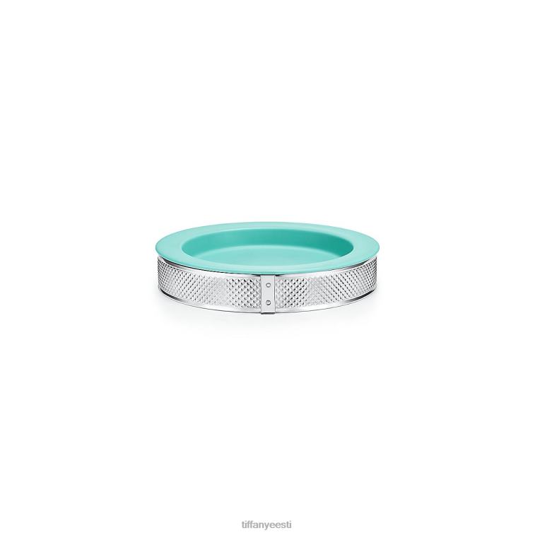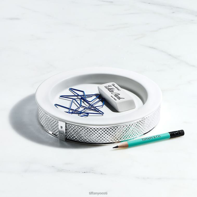 teemantteraga ümmargune valge portselanist ja hõbedast vaagen.