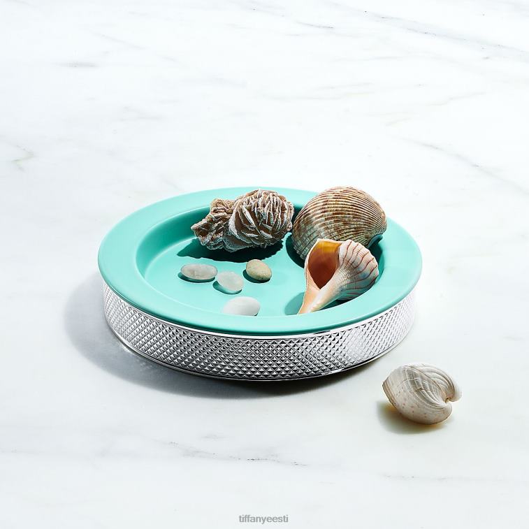 teemantteraga ümmargune tiffany-sinisest portselanist ja hõbedast roog.