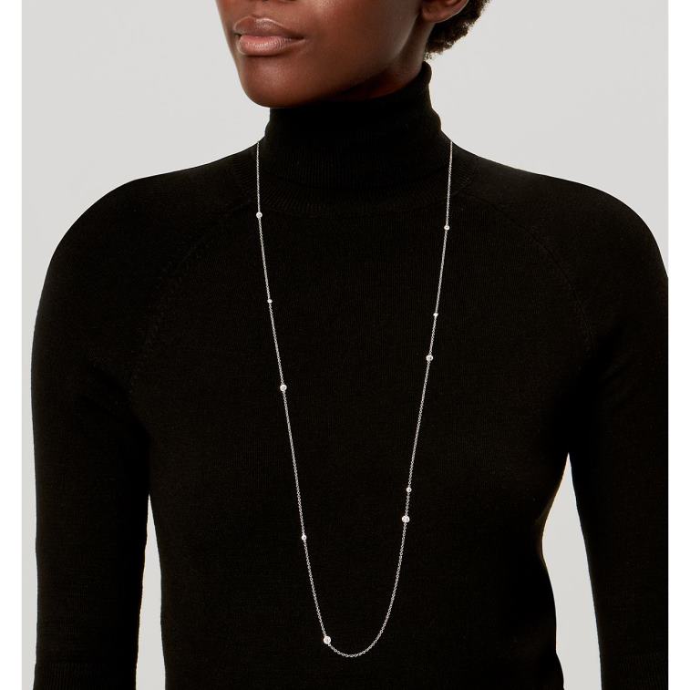 Tiffany ümarad teemandid püüavad valgust ja panevad selle tantsima. puista plaatina kaelakee 12 ümmarguse briljantse teemantiga. 36'' pikk. karaat kogukaal 1,21. originaalkujundused, mille autoriõigused on elsa peretti.