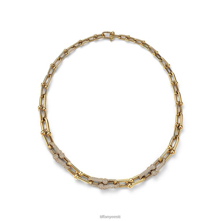 Tiffany hardwear on inspireeritud New York City suhtumisest ja energiast. sellel julgel 18k kullast kaelakeel on kollektsioonile iseloomulikud mõõteriistade lingid lõpuproportsioonides. vahelduvad lingid on maksimaalse sära saavutamiseks hoolikalt seatud ümmarguste briljantsete teemantidega kärgstruktuuris. oma silmapaistva tekstuuride koosmõjuga ei saa see disain muud üle kui pead pöörama.
