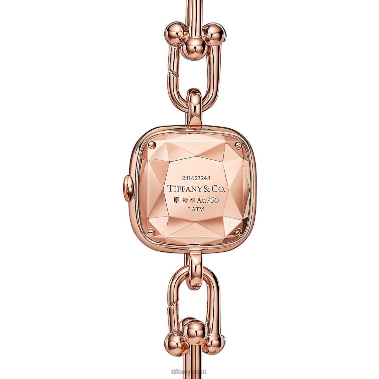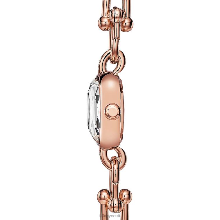 Tiffany vastupidavad käekellad on sama julged kui viimistletud. Šveitsis käsitööna valminud kelladel on ikoonilised mõõdiku lingid ja briljantsed teemandid. sellel 18k roosast kullast kellal on sillutatud teemandid ja valge pärlmutrist sihverplaat. peidetud lukk loob voolujoonelise disaini, lihvitud safiirklaasist kristall aga kutsub esile legendaarse Tiffany teemandi ainulaadse kuju. see annab kauni välimuse, kui seda kantakse eraldi või Tiffany kõvakattega käevõrudega.