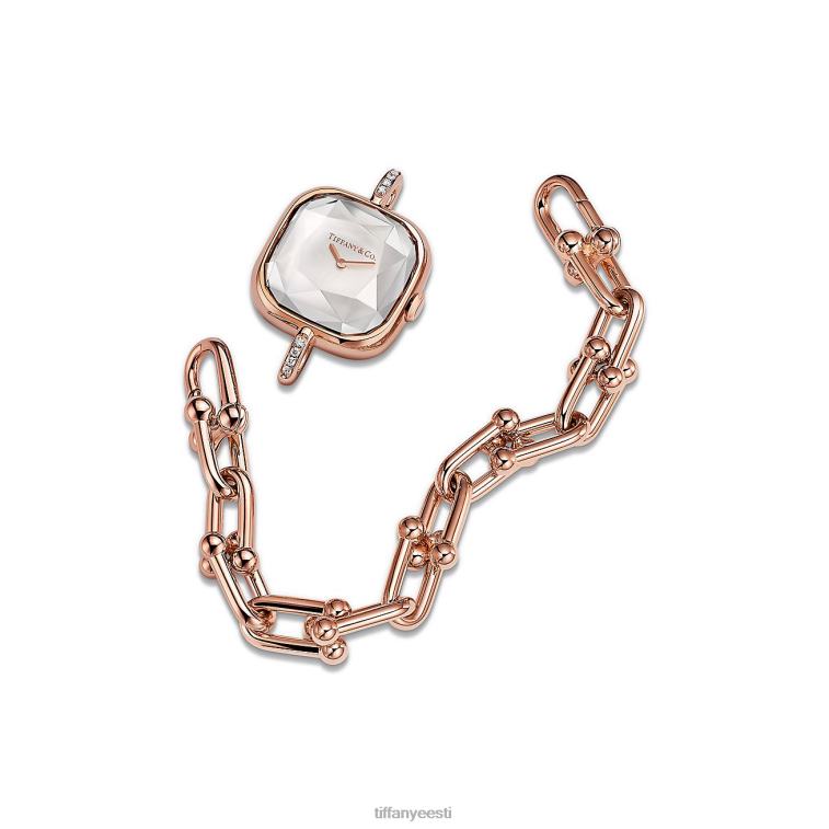 Tiffany kõvarõivaste käevõrud on nii julged kui ka rafineeritud. Šveitsis käsitööna valminud kelladel on ikoonilised mõõdiku lingid ja briljantsed teemandid. sellel 18k roosast kullast kellal on sillutatud teemandid ja valge pärlmutrist sihverplaat. peidetud lukk loob voolujoonelise disaini, lihvitud safiirklaasist kristall aga kutsub esile legendaarse Tiffany teemandi ainulaadse kuju. see annab ilusa välimuse, kui seda kantakse eraldi või Tiffany kõvarõivaste käevõrudega.
