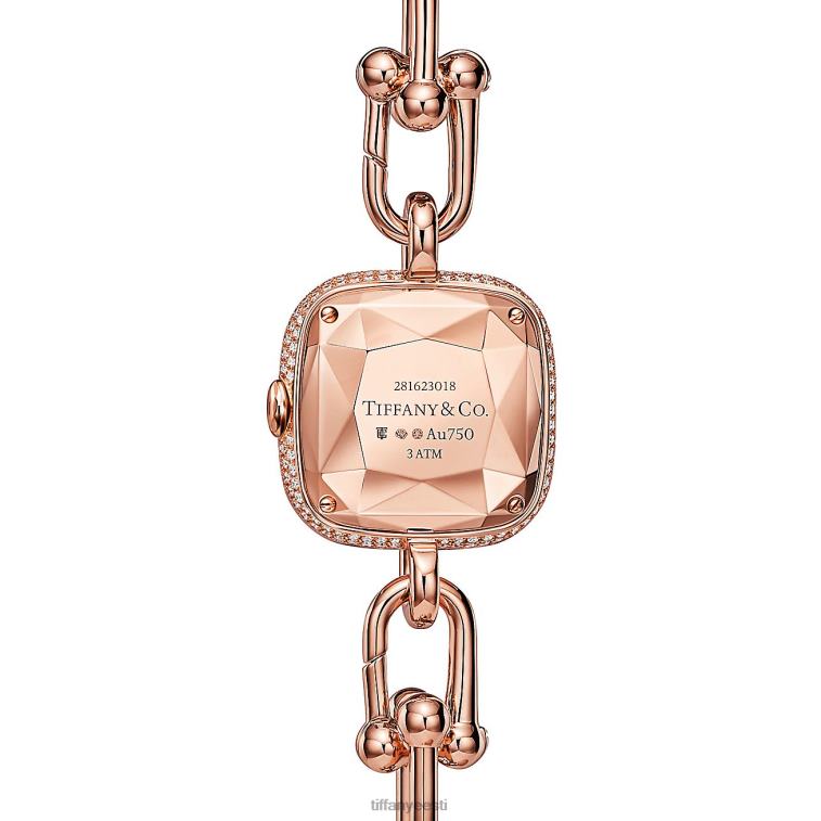 Tiffany vastupidavad käekellad on sama julged kui viimistletud. Šveitsis käsitööna valminud kelladel on ikoonilised mõõdiku lingid ja briljantsed teemandid. sellel 18k roosast kullast kellal on sillutatud teemandid ja musta lakiga sihverplaat. peidetud lukk loob voolujoonelise disaini, lihvitud safiirklaasist kristall aga kutsub esile legendaarse Tiffany teemandi ainulaadse kuju. see annab kauni välimuse, kui seda kantakse eraldi või Tiffany kõvakattega käevõrudega.