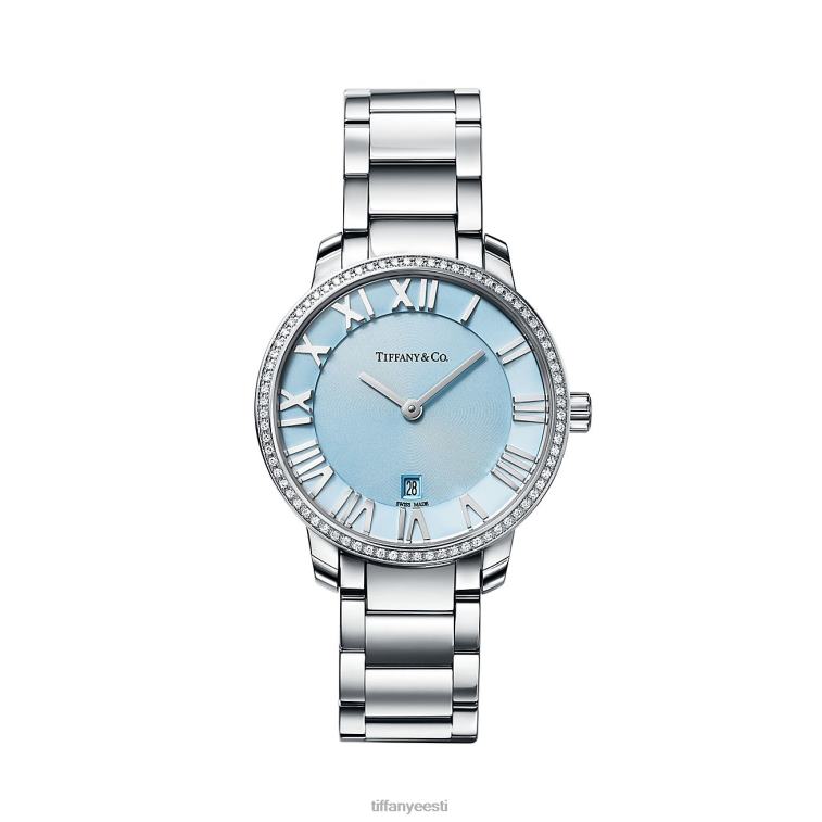 Roostevabast terasest naiste käekell. Tiffany sinine taevasinine sihverplaat ümarate briljantsete teemantidega. karaat kogukaal ,14. 31 mm korpus. kvartsi liikumine. veekindel kuni 50 meetrit/160 jalga/5 atm. Šveitsis valmistatud.