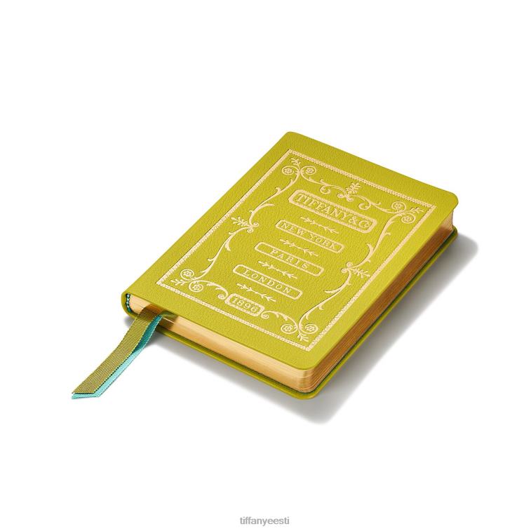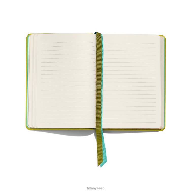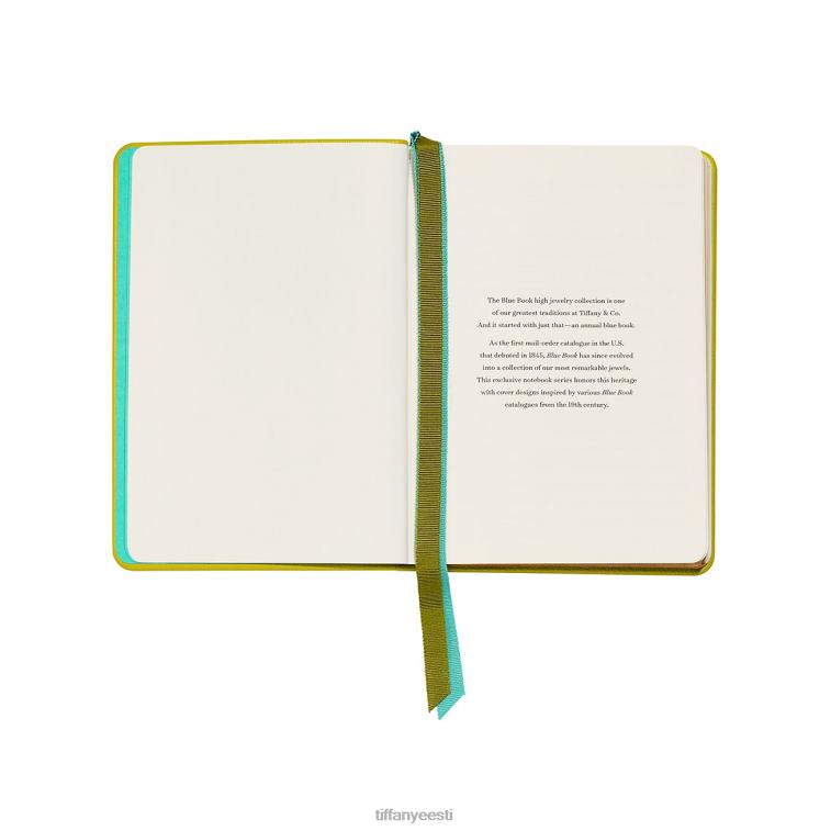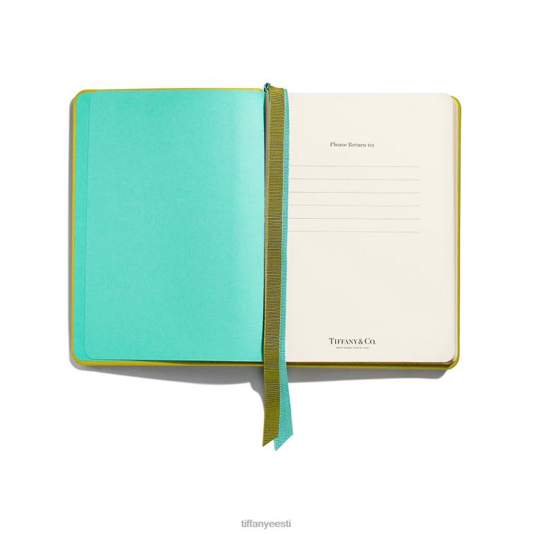See tsitriinkollaste nahkköites märkmik, mis on inspireeritud maja sinistest 1890. aastatest pärit raamatukaantest, on kullatud lehtede servade, metallilise fooliumiga, tiffany-sinise aktsentide ja täidisega paeltega. tühjad ja joonelised leheküljed pakuvad märkmete tegemiseks kahte lõuendit.