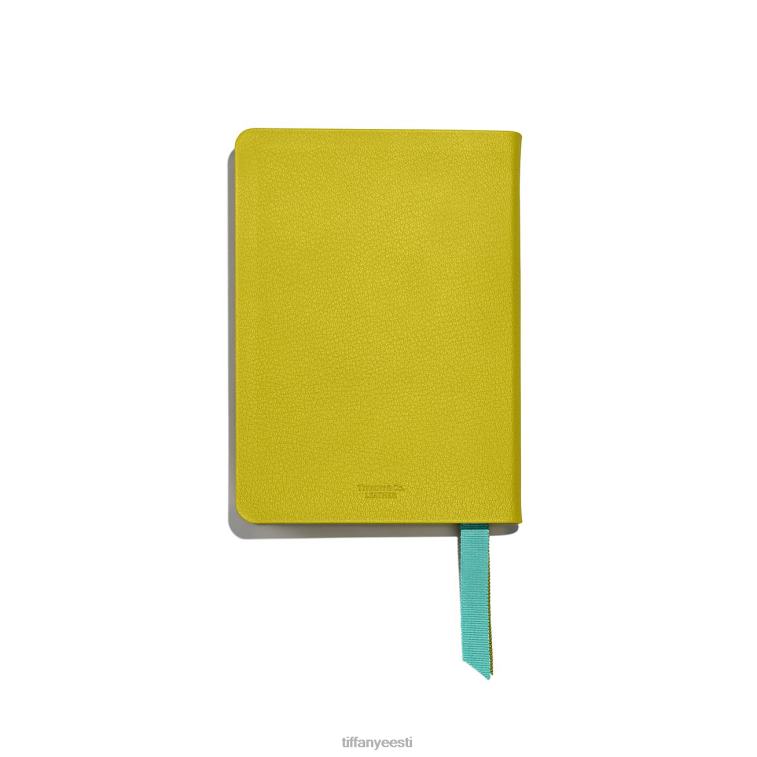 See tsitriinkollase nahkköites märkmik on inspireeritud maja sinistest 1890. aastatest pärit raamatukaantest ning sellel on kullatud lehtede servad, metallik fooliumiga, tiffany sinised aktsendid ja graanus. lindid kohahoidmiseks. tühjad ja joonelised lehed pakuvad märkmete tegemiseks kahte lõuendit.