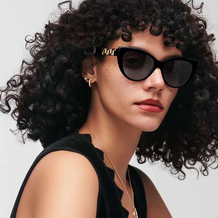 Tiffany t-kollektsiooni iseloomustab elegantne t-motiiv. inspireeritud meie lemmikkirjast. need klassikalised kassisilmakujulised päikeseprillid saavad moodsa kujunduse, julge korduva t-mustriga käevarrel ning on täpselt valmistatud musta atsetaadiga tumehallide klaasidega.