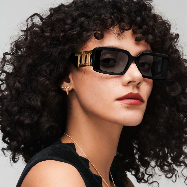 Tiffany t-kollektsiooni iseloomustab elegantne t-motiiv, mis on inspireeritud meie lemmikust kiri. Klassikalised ristkülikukujulised päikeseprillid saavad moodsa vimka koos julge korduva t-mustriga käevarrel ning on täpselt viimistletud musta atsetaadiga tumehallide klaasidega.