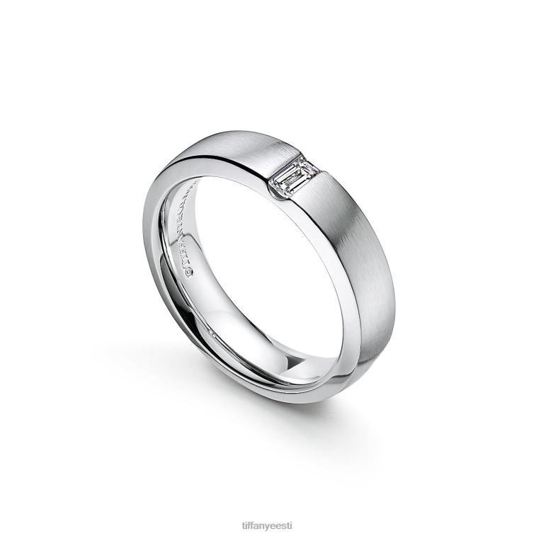 Charles Tiffany seadekollektsioonis on moodsa paari jaoks mõeldud kaasaegsed bändisõrmuse siluetid. selle harjatud satiinviimistlusega tekstureeritud plaatinast sõrmuse keskelt paistab baguette teemant.Märkus, graveeritud esemed toimetatakse kohale pärast isadepäeva.