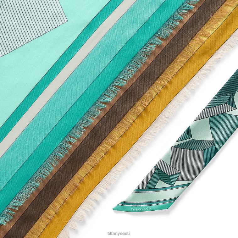 Tiffany t kollektsioon on inspireeritud meie lemmikkirjast. sellel siidist lintsallil on meie ikoonilises Tiffany sinises värvitoonis julge t-motiiv, mis on segatud geomeetriliste vormidega. siduge tiffany salli rõngaga või seo kunstlikult ümber oma lemmikkäekoti.