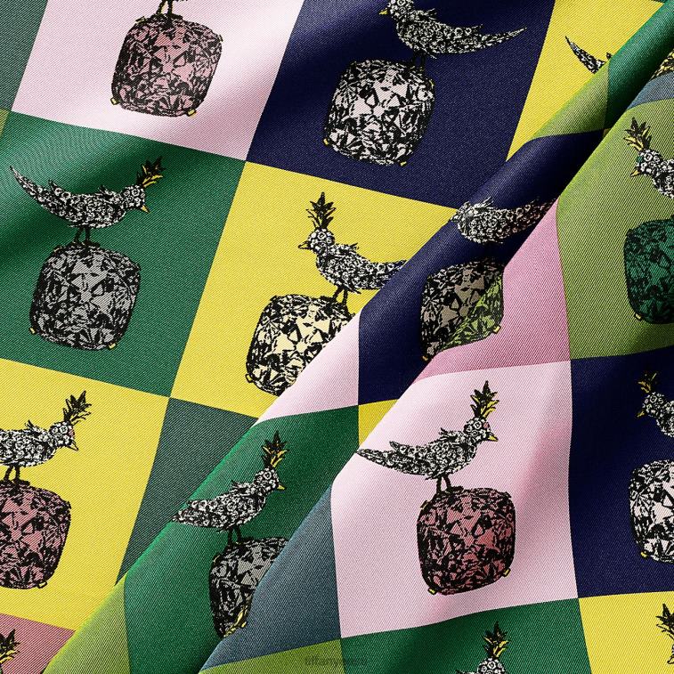 Jean Schlumbergeri lind kiviprossil on üks 21. sajandi ikoonilisemaid ehtekujundusi. keskkond kujundati algselt 1960. aastatel ja on sellest ajast alates taasloodud maailma kõige uskumatumate vääriskivide jaoks. sellel värvilisel ruudukujulisel siidsallil on popkunsti stiilis ruudustiku mustriga kuulsa prossi kujutised. siduge tiffany salli rõngaga või seo kunstlikult ümber oma lemmikkäekoti.