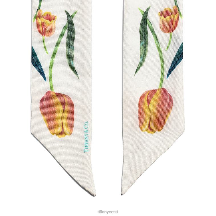 See loodusmaailma ilust inspireeritud siidist valmistatud Tiffany botanica lintsall sisaldab silmatorkavat segu lilledest. orhideed ja tulbid loovad valgel taustal elava ilme. seo kunstlikult ümber oma lemmikkäekott või ühenda tiffany sallirõngaga.