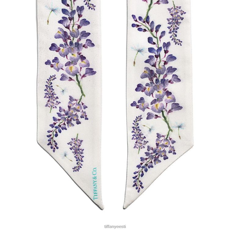 See loodusmaailma ilust inspireeritud siidist valmistatud Tiffany Botanica lintsall on valgel taustal erksa wisteriaga. seo kunstlikult ümber oma lemmikkäekott või ühenda tiffany sallirõngaga.