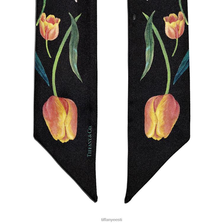 See loodusmaailma ilust inspireeritud siidist valmistatud Tiffany botanica lintsall sisaldab silmatorkavat segu lilledest. orhideed ja tulbid loovad mustal taustal elava ilme. seo kunstlikult ümber oma lemmikkäekott või ühenda tiffany sallirõngaga.